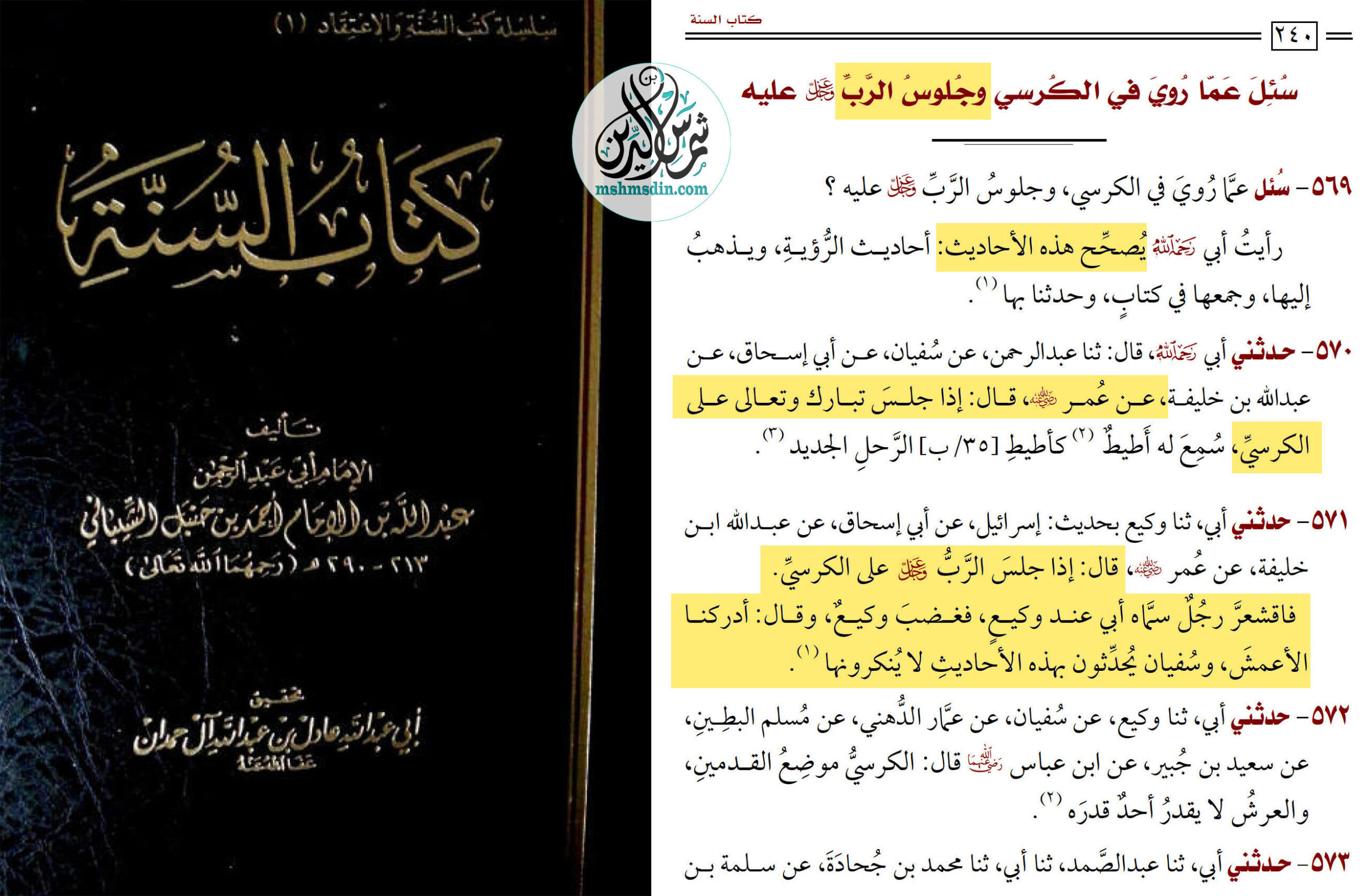 «قال الحافظ عبد الغني: وأنبا أبو الغنائم الترك محمود بن أحمد الأصبهاني بها أنبا أبو طاهر الخفي بن الفضل الصفار أنبنا أبو عمر عبدالوهاب ابن الحافظ أبي عبدالله بن منده أنبا أبي قراءة عليه، وأبو عمر عبدالله بن محمد بن عبدالوهاب إذناً قالا: أنبا أبو الحسن أحمد بن محمد بن عمر بن أبان العبدي اللبناني ثنا أبو عبدالرحمن عبدالله بن أحمد بن حنبل قال: ُسئل أبي عما روي في الكرسي وجلوس الرب عليه جلا ثناؤه؟ رأيتُ أبي رضي الله عنه يصحح هذه الأحاديث؛ أحاديث الرؤية، ويذهب إليها، وجمعها في كتاب وحدثنا بها رضي الله عنه» اثبات الحد للدشتي ص219