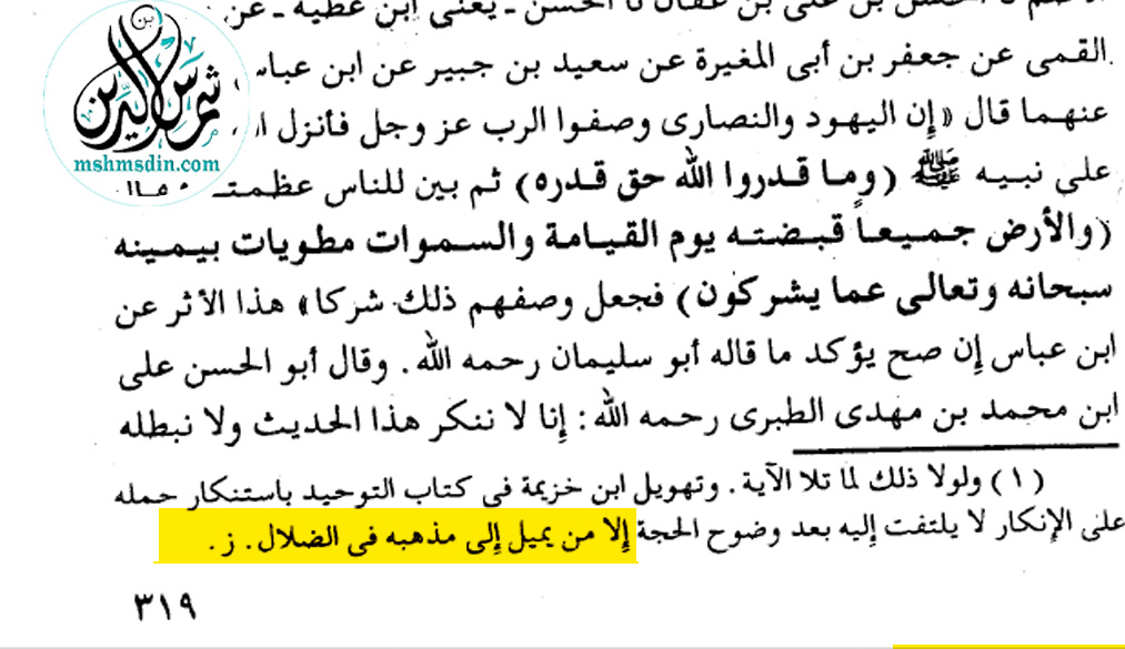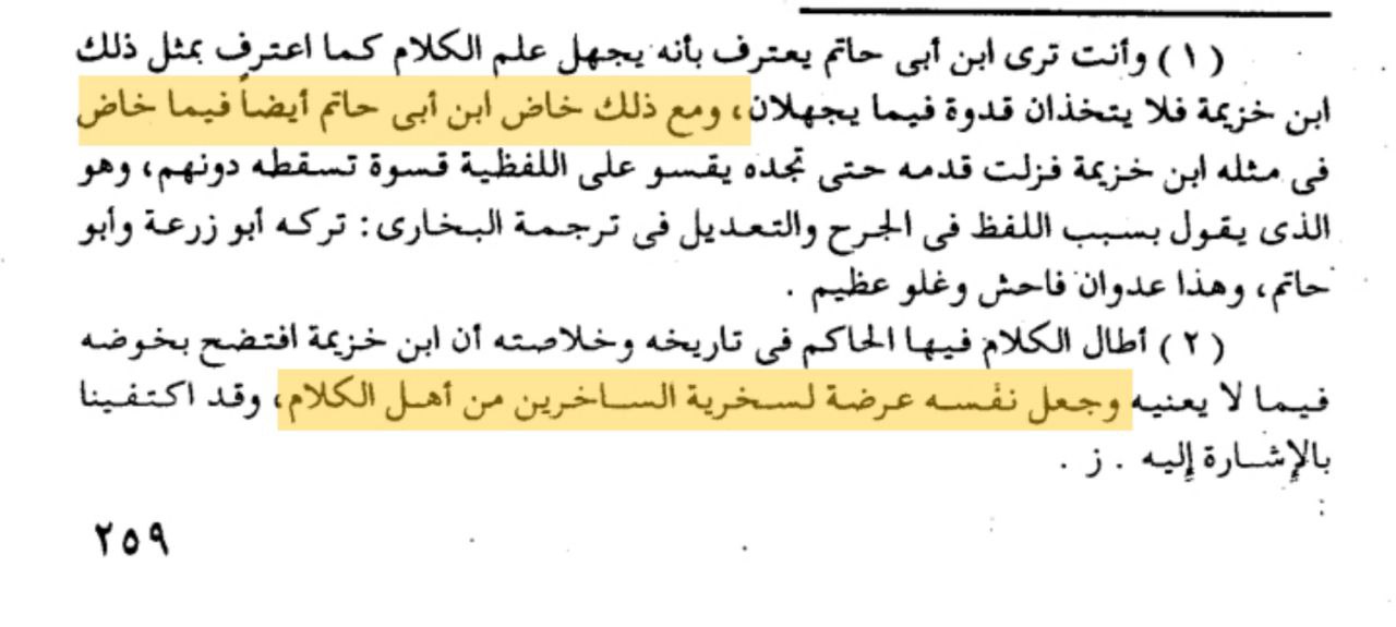 | وقال: (ابن خزيمة افتضح بخوضه فيما لا يعنيه، وجعل نفسه عرضة لسخرية الساخرين من أهل الكلام) [حاشية الأسماء والصفات للبيهقي (ص259)] |