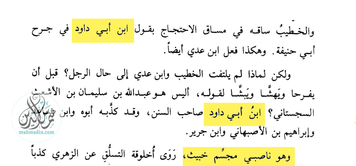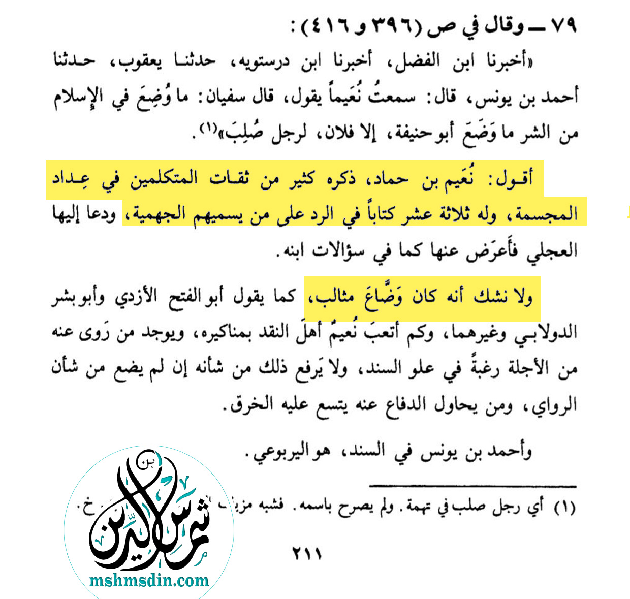 | قال مفتريًا: (ونعيم بن حماد معروف باختلاق مثالب ضد أبي حنيفة، وكلام أهل الجرح والتعديل فيه واسع الذيل، وذكره غير واحد من كبار علماء أصول الدين في عداد المجسمة، بل القائلين باللحم والدم) [تأنيب الخطيب ص100]