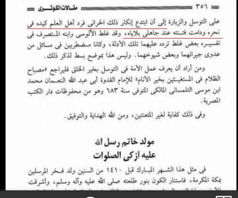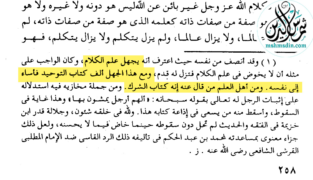 | قال عنه: (ومع هذا الجهل ألف كتاب التوحيد فأساء إلى نفسه. ومن أهل العلم من قال عنه إنه كتاب الشرك. ومن جملة مخازيه)[بيان تلبيس المفتري (ص258)] |