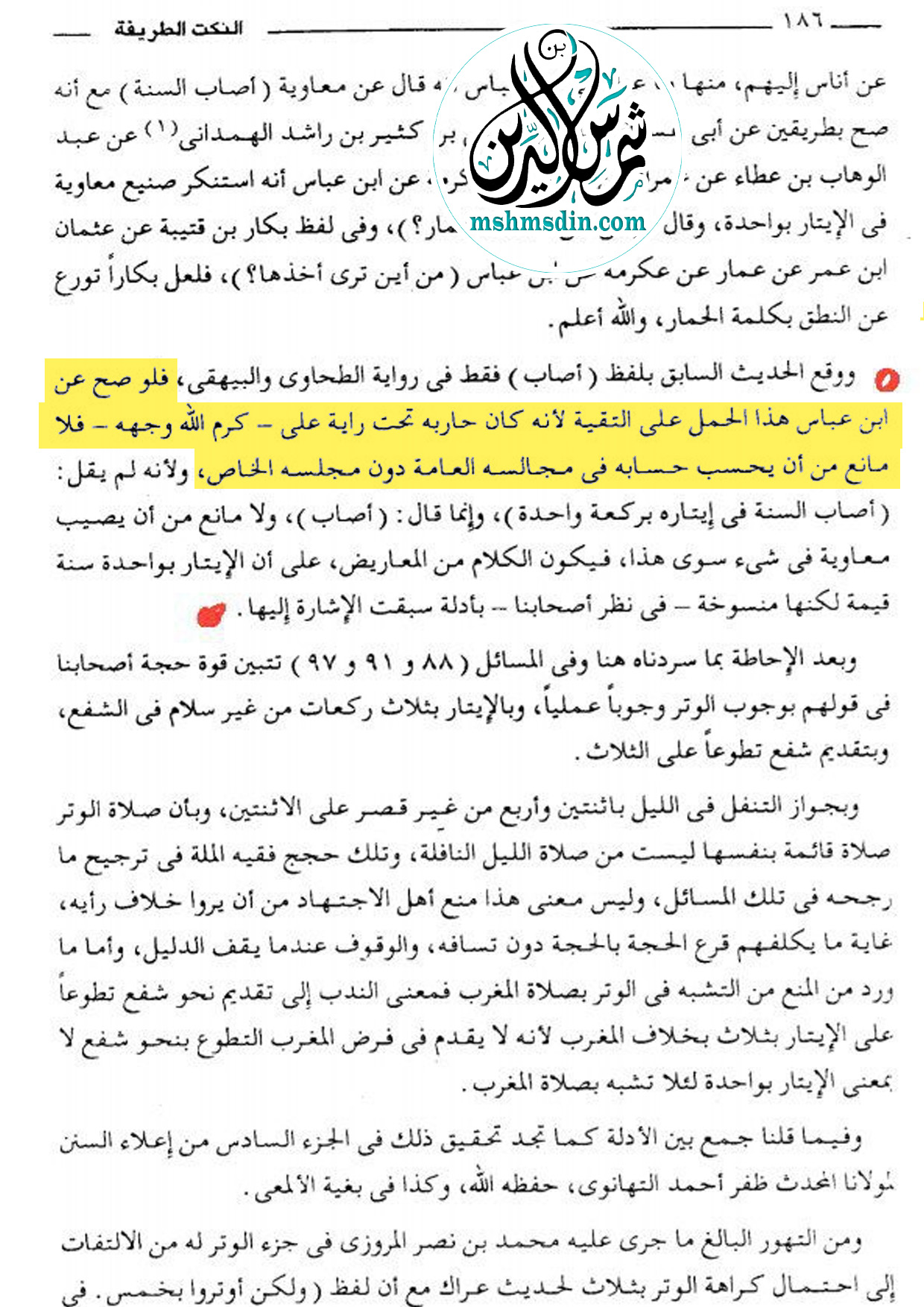 | قال في (ص197) من “النكت” عن الحديث الذي خرجه ابن أبي شيبة عن عطاء، قال: أوتر معاوية بركعة، فأنكر ذلك عليه، فسئل عنه ابن عباس فقال: أصاب السنة، ما نصه: (فلو صح عن ابن عباس هذا لحُمل على التقية!، لأنه كان حاربه تحت راية علي -كرم الله وجهه- فلا مانع من أن يحسب حسابه في مجالسه العامة دون مجلسه الخاص)