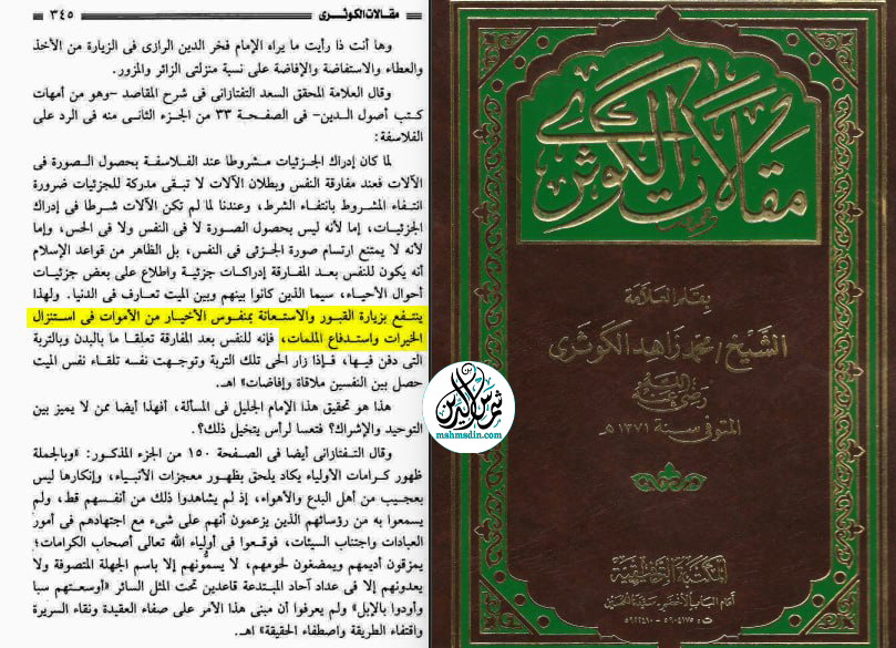 | قال الكوثري: «لا بد لأهل السلوك والرشاد من التوسل والاستغاثة والاستمداد بأرواح الأجلة، والسادة الأمجاد، إذ هم المالك لأزمة الأمور في نيل ذلك المراد». [«البحوث السنية عن بعض رجال أسانيد الطريقة الخلوتية» (ص40)] |