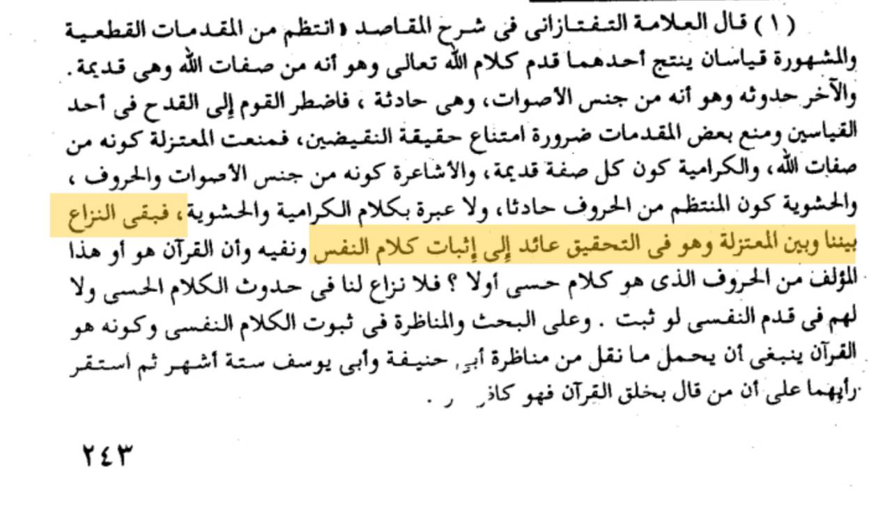 | وقال: (فبقى النزاع بيننا وبين المعتزلة وهو في التحقيق عائد إِلى إِثبات كلام النفس) |
