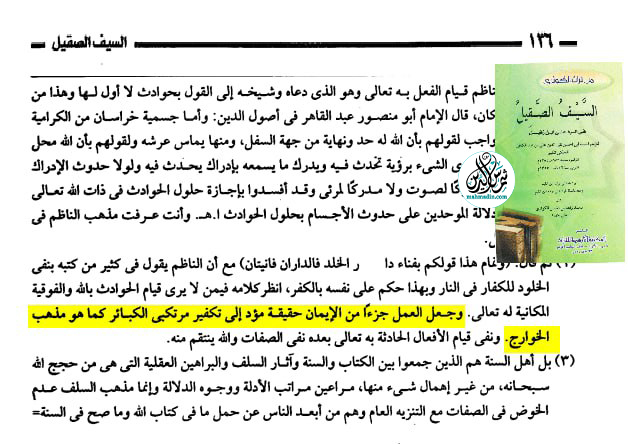 | وقال: (وجعلُ العملِ جزءا من الإيمان حقيقة مؤد إلى تكفير مرتكبي الكبائر كما هو مذهب الخوارج) [السيف الصقيل ص163] |
