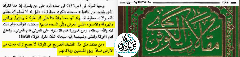 | قال: (وهذا اعتقادهم في كلام الله سبحاته، وبشاعة ذلك ظاهرة جدا، حيث جعل كلامه تعالى صوتا) [المقالات ص298] |