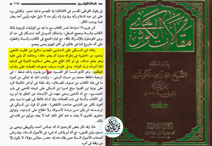 وقال: (وثناء ابن السبكي على الدارمي المجسم ناشئ من تقليد الذهبي