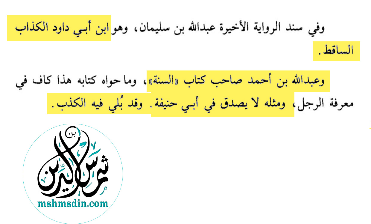 | اتهمه بالكذب، فقال: (وعبدالله بن أحمد صاحب كتاب ((السنة))، وما حواه كتابه هذا كاف في معرفة الرجل، ومثله لا يصدق في أبي حنيفة. وقد بُلي فيه الكذب.)