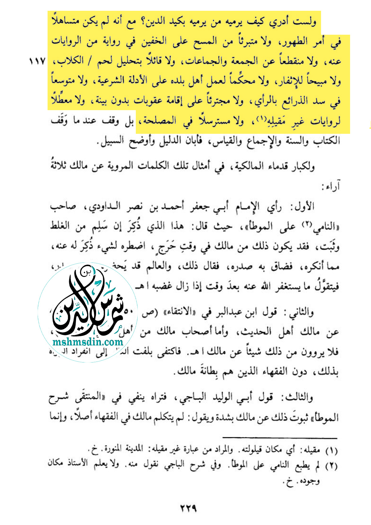 نقل بعض الأمور المنقولة عن الإمام مالك مما قد يُنتقد عليه، وكأنه يقول: قائل هذه الأقوال هو من كاد الدين. |