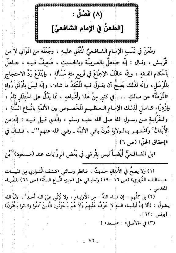 | قال الغماري: (وطعن في نسب الإمام الشافعي المتفق عليه، وجعله من الموالي لا من قريش، وقال: إنه جاهل بالعربية والحديث، ضعيف فيه، جاهل بأحكام الفقه، وإنه خالف الإجماع في أربع مائة مسألة، وابتدع رد الاحتجاج بالمرسل، وإنه لذلك يصح أن يقول فيه المنتقد ما شاء، وإنه ليس بأوثق رواة الموطأ عن مالك .. في كثير من هذا وأشباهه، مما يدل على احتقار تام، وازدراء كامل لذلك الإمام العظيم المخصوص بين الأئمة باتباع السنة .. -ثم نقل أقواله بنصوصها) [بيان تلبيس المفتري (ص72)] |