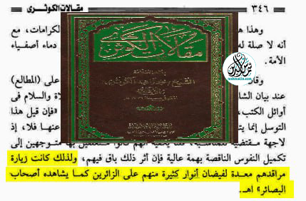 | ونقل مستشهدا: (ولذلك كانت زيارة مراقدهم معدة لفيضان أنوار كثيرة منهم على الزائرين كما يشاهده أصحاب البصائر) [المقالات ص346] |