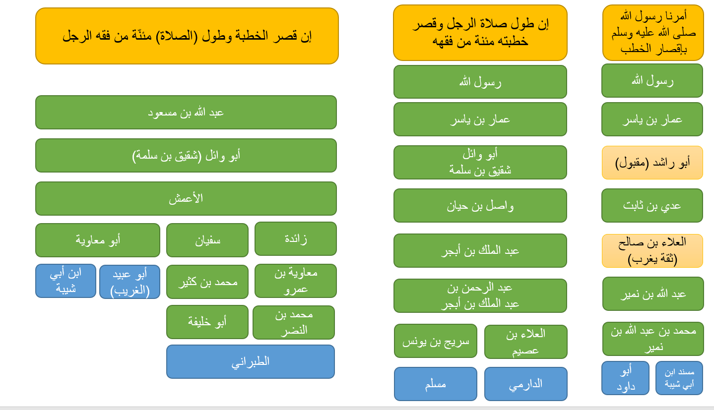 | 47 – (869) حدثني سريج بن يونس ، حدثنا عبد الرحمن بن عبد الملك بن أبجر ، عن أبيه ، عن واصل بن حيان ، قال: قال أبو وائل: « خطبنا عمار . فأوجز وأبلغ. فلما نزل قلنا: يا أبا اليقظان! لقد أبلغت وأوجزت. فلو كنت تنفست! فقال: إني سمعت رسول الله صلى الله عليه وسلم يقول: إن طول صلاة الرجل، وقصر خطبته، مئنة من فقهه. فأطيلوا الصلاة واقصروا الخطبة. وإن من البيان سحرا ». |