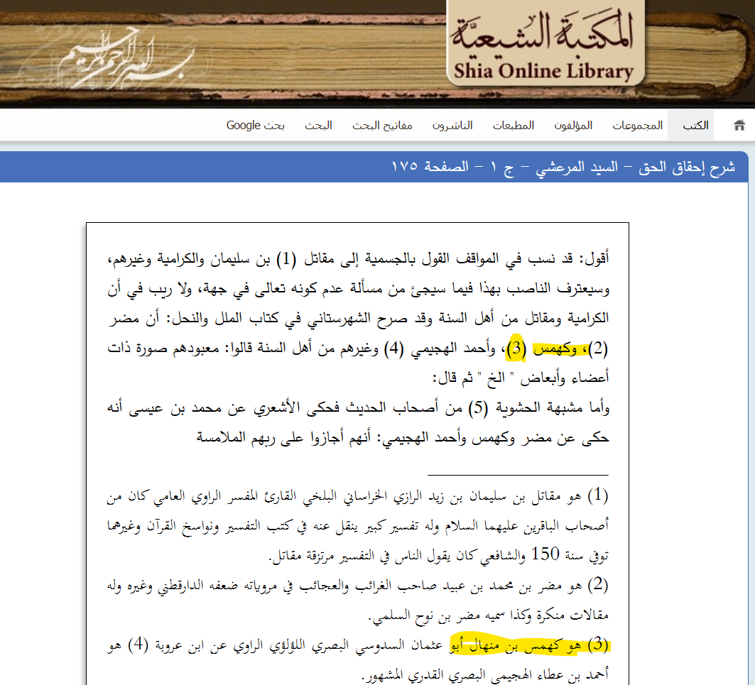 قد أكثر الرًّافضة من اتِّهام الإمام كهمس بن المنهال بالتجسيم، وينسبون هذه التهمة إلى الشَّهرستاني.