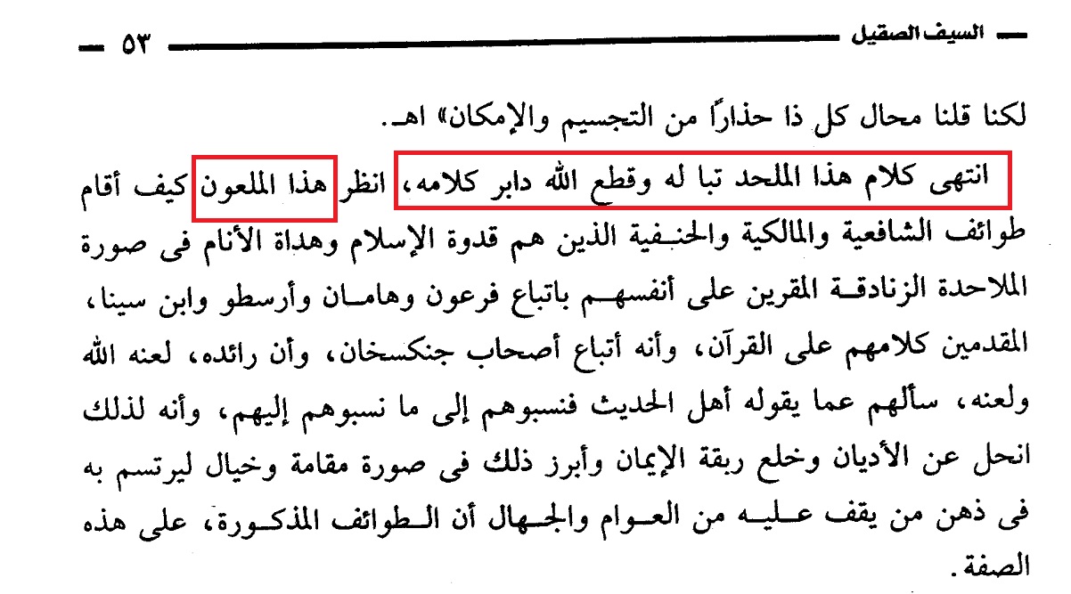 (انتهى كلام هذا الملحد تبّاً له وقطع الله دابر كلامه) [السيف الصقيل ص53]