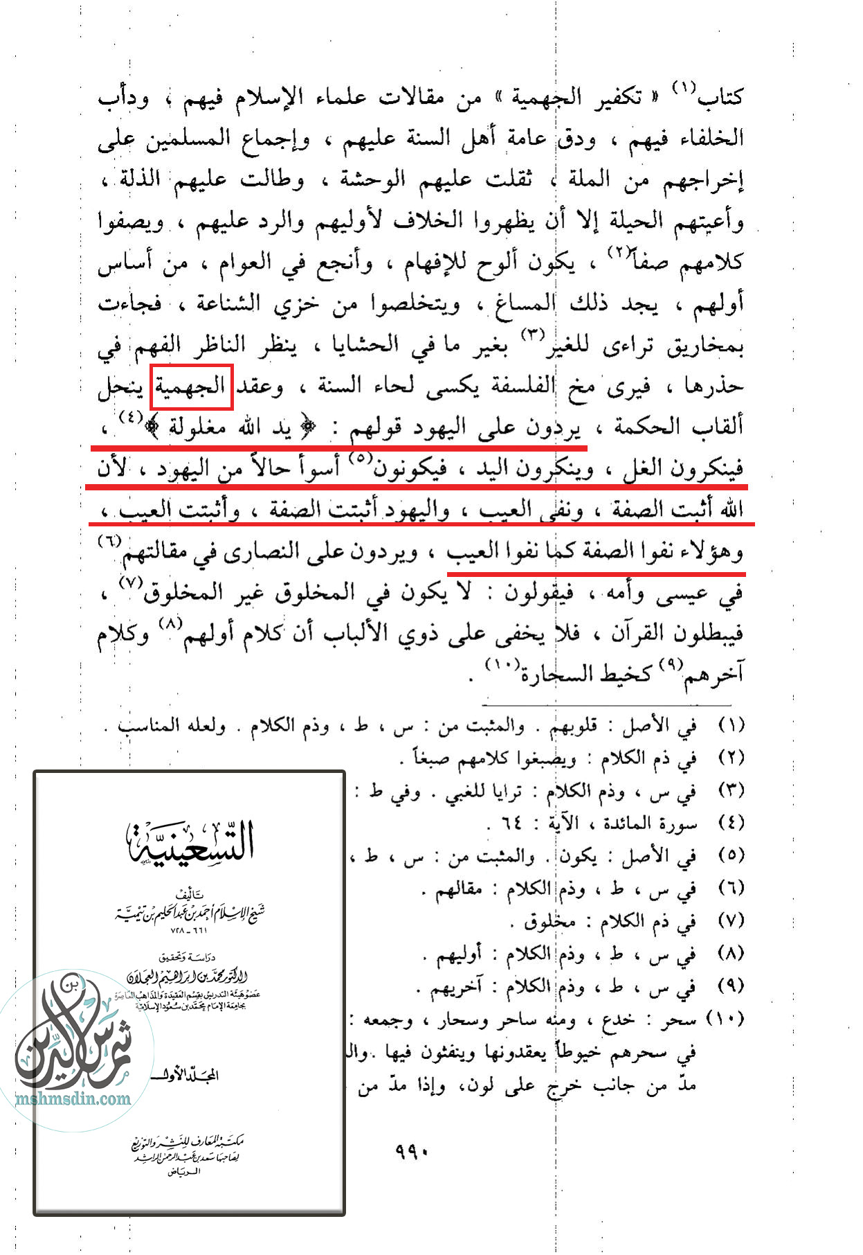 قال ابن تيمية: «يردون على اليهود قولهم: {يَدُ اللَّهِ مَغْلُولَةٌ}، فينكرون الغل، وينكرون اليد، فيكونون أسوأ حالًا من اليهود، لأن الله أثبت الصفة، ونفى العيب، واليهود أثبتت الصفة، وأثبتت العيب، وهؤلاء نفوا الصفة كما نفوا العيب،». [التسعينية (3/ 990)]