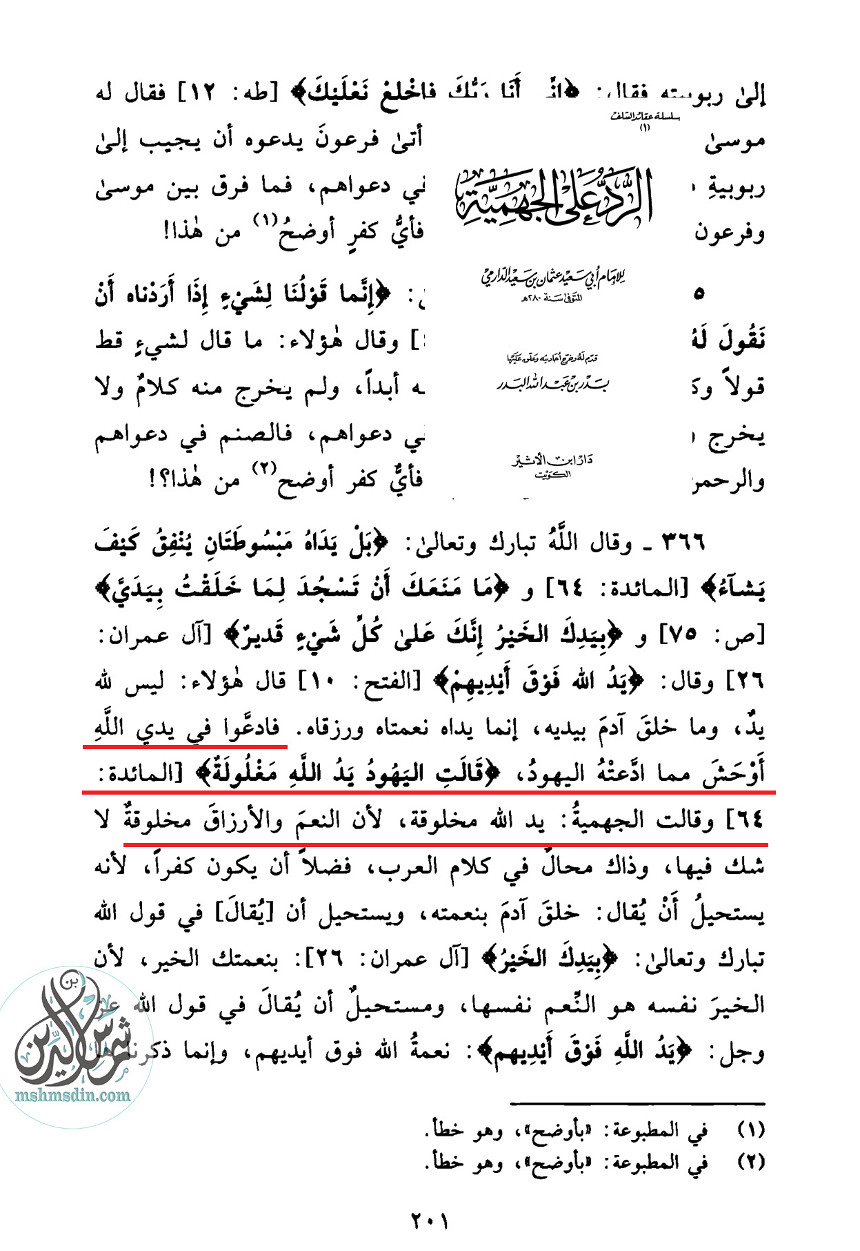 قال الدارمي: «وقال: {يد الله فوق أيديهم} [الفتح: 10] . قال هؤلاء: ليس لله يد، وما خلق آدم بيديه، إنما يداه نعمتاه ورزقاه. فادعوا في يدي الله أوحش مما ادعته اليهود {قالت اليهود يد الله مغلولة} [المائدة: 64] ، وقالت الجهمية: يد الله مخلوقة، لأن النعم والأرزاق مخلوقة». [الرد على الجهمية للدارمي – ت البدر (ص201)]