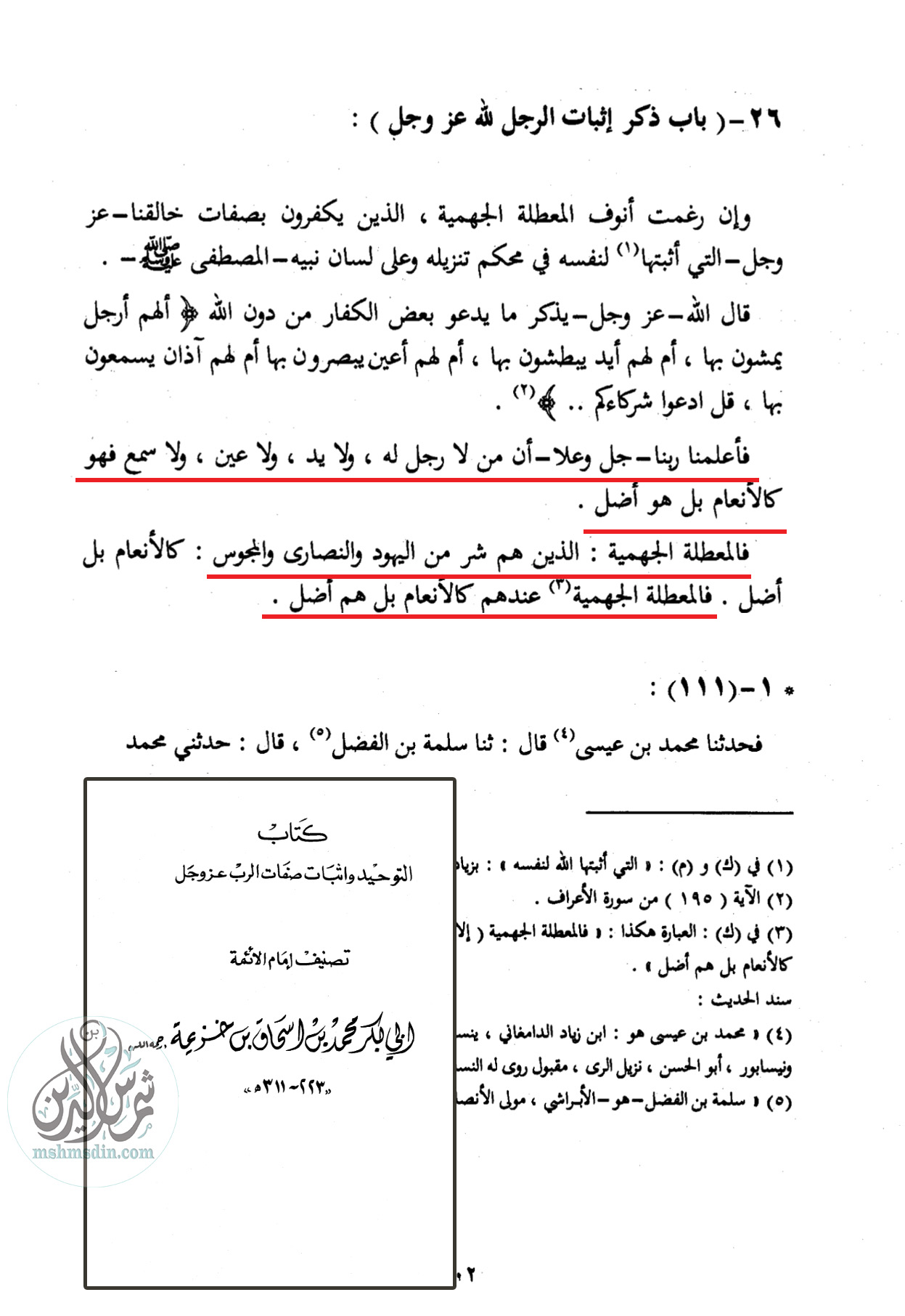 قال ابن خزيمة: «قال الله عز وجل يذكر ما يدعو بعض الكفار من دون الله: {ألهم أرجل يمشون بها، أم لهم أيد يبطشون بها، أم لهم أعين يبصرون بها أم لهم آذان يسمعون بها، قل ادعوا شركاءكم} [الأعراف: 195] فأعلمنا ربنا جل وعلا أن من لا رجل له، ولا يد، ولا عين، ولا سمع فهو كالأنعام بل هو أضل ، فالمعطلة الجهمية: الذين هم شر من اليهود والنصارى والمجوس: كالأنعام بل أضل؛ فالمعطلة الجهمية عندهم كالأنعام بل هم أضل». [التوحيد لابن خزيمة (1/ 202)]