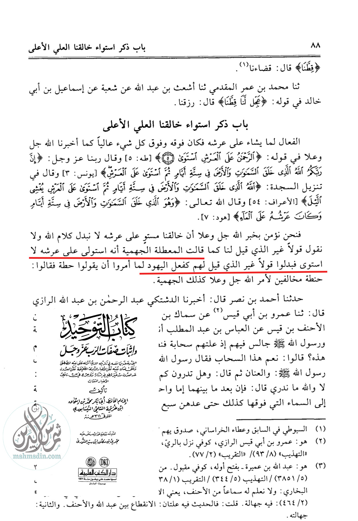 قال ابن خزيمة: «فنحن نؤمن بخبر الله جل وعلا أن خالقنا مستو على عرشه، لا نبدل كلام الله، ولا نقول قولا غير الذي قيل لنا، كما قالت المعطلة الجهمية: إنه استولى على عرشه، لا استوى، فبدلوا قولا غير الذي قيل لهم، كفعل اليهود كما أمروا أن يقولوا: حطة، فقالوا: حنطة، مخالفين لأمر الله جل وعلا كذلك الجهمية». [التوحيد لابن خزيمة (1/ 233)]