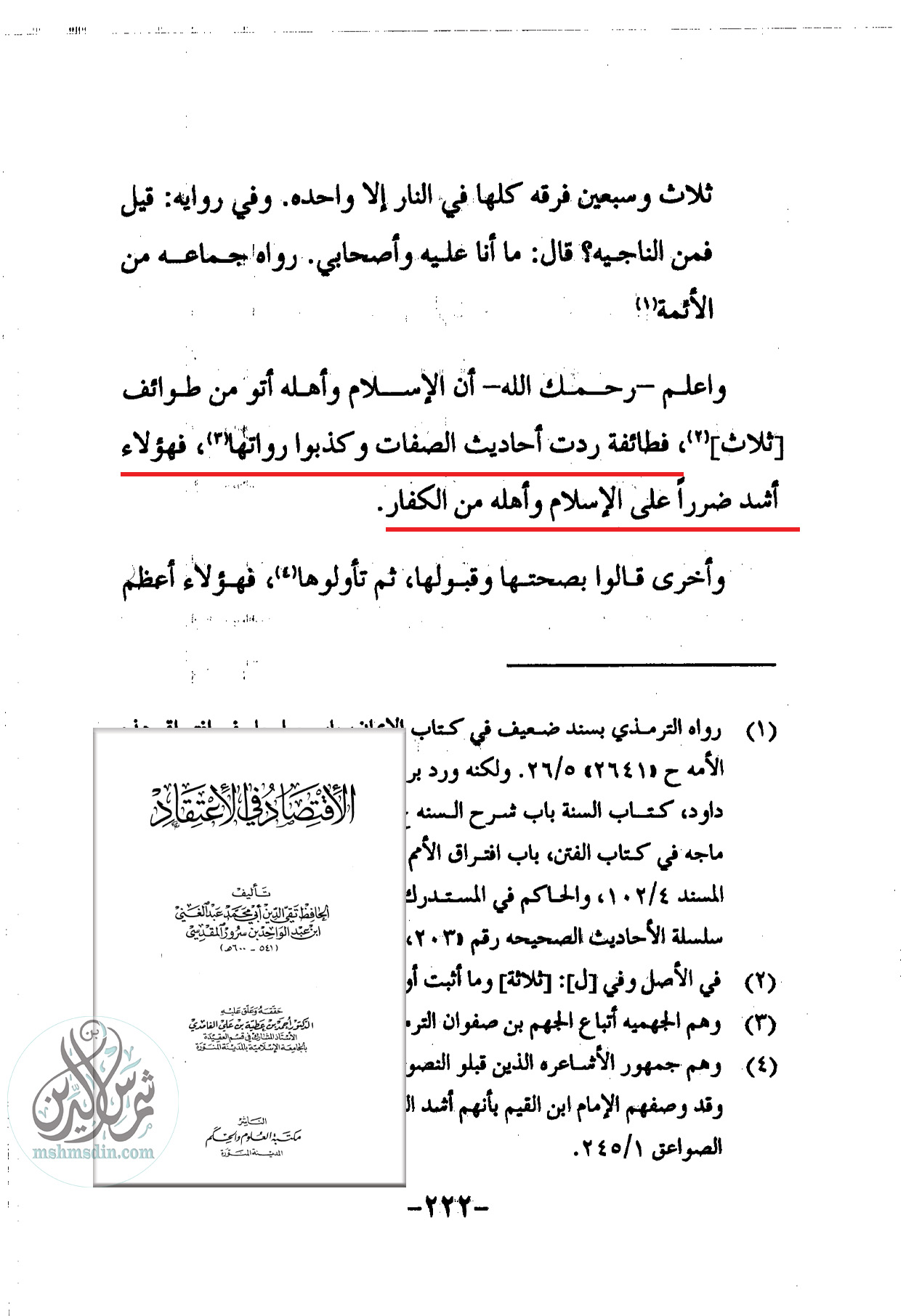 قال عبد الغني المقدسي: «فطائفة ردت أحاديث الصفات وكذبوا رواتها3، فهؤلاء أشد ضرراً على الإسلام وأهله من الكفار.». [الاقتصاد في الاعتقاد للمقدسي (ص222)]