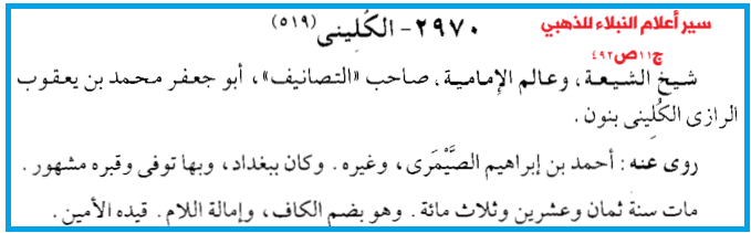 هذه ترجمة الكليني الرافضي عند الذهبي الذي إذا لم يذكر شخصا ببدعة صار الشخص من الفرقة الناجية!