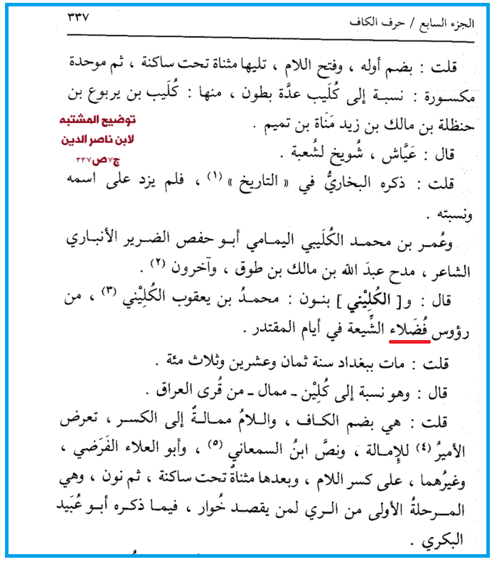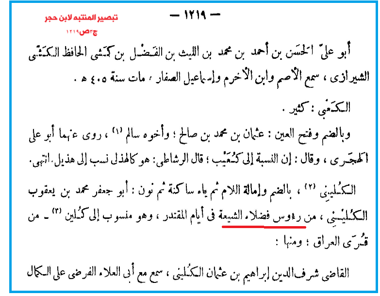 وهذا إمامهم ابن حجر (الذي يصفونه بالمتذبذب [ هنا https://modajana.com/archives/2439 وهنا https://modajana.com/archives/2155 ] ) يصف الكليني بأنه من فضلاء الشيعة