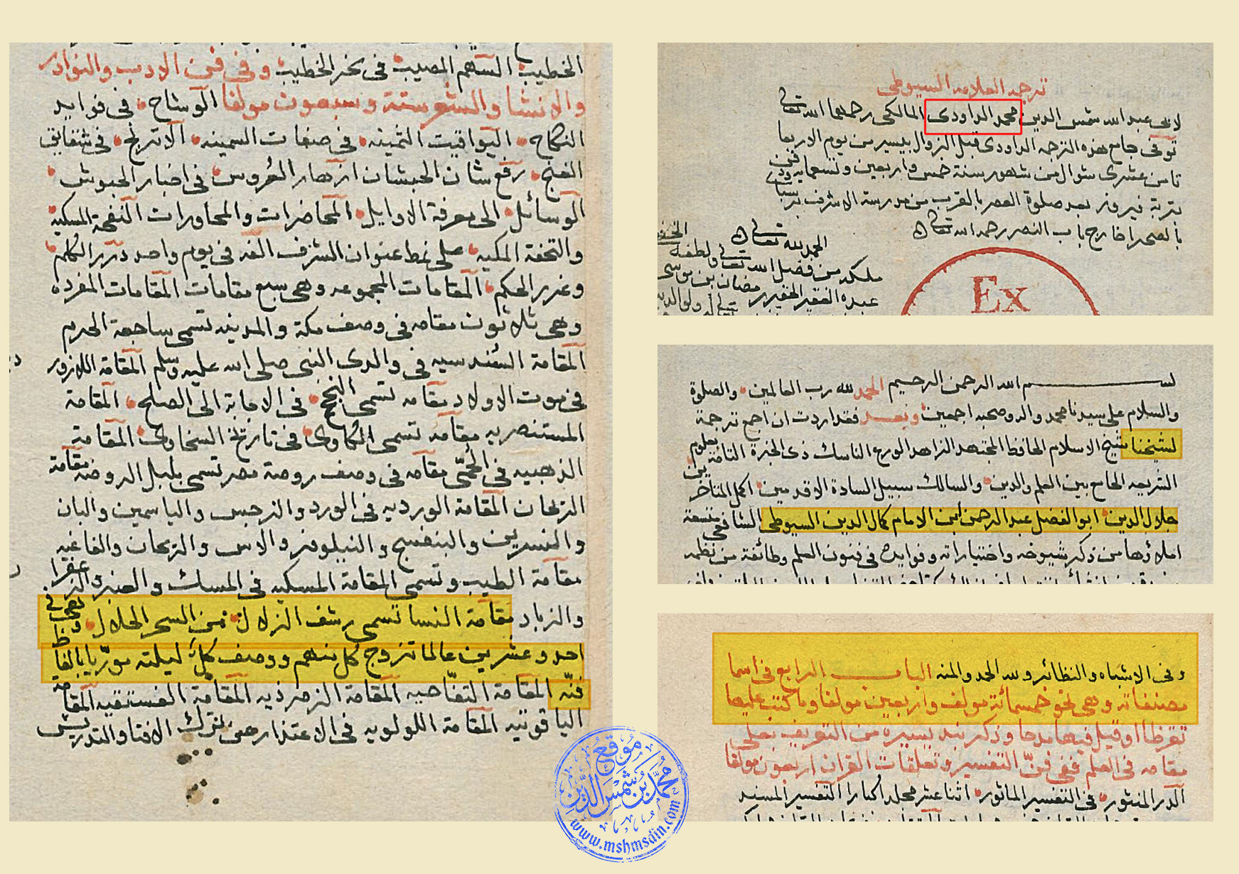 كما أكد ذلك تلميذه شمس الدين محمد بن علي الداوودي في تاريخه (الصفحة 178)، وفي مخطوط ترجمته للسيوطي (الباب الرابع، الصفحة 28)، حيث سمى المقامة ووصف محتواها بدقة تامة.