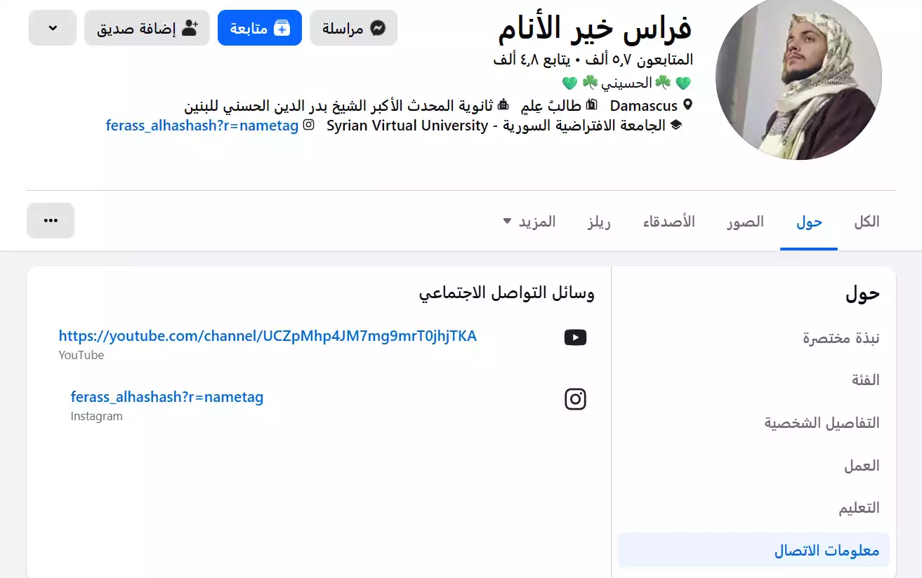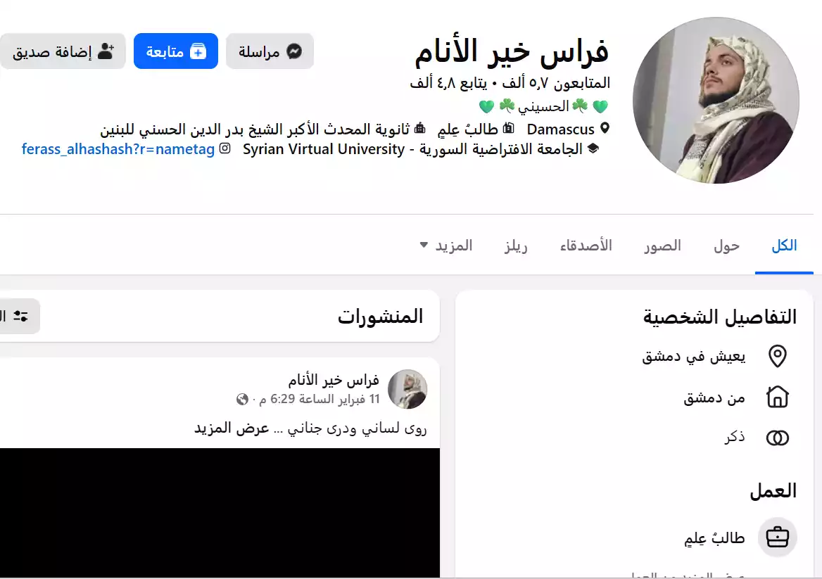 • اسم الحساب: فراس خير الأنام. (من خلال اسم حسابه على انستاجرام يتضح أن اسمه فراس الحشاش)