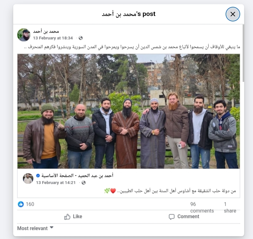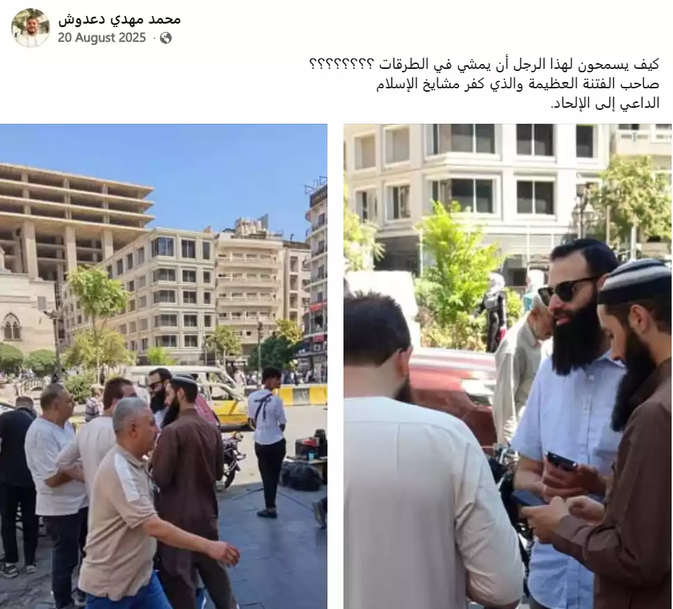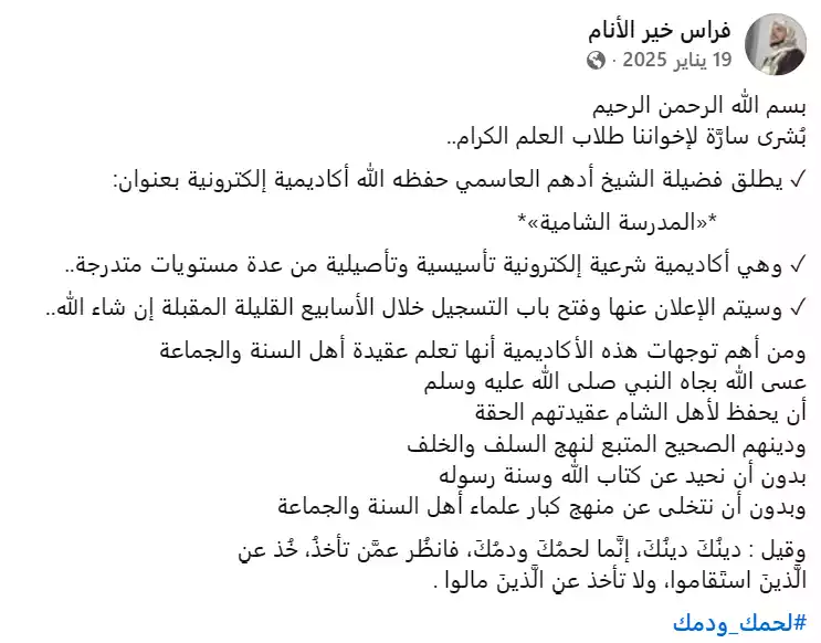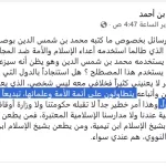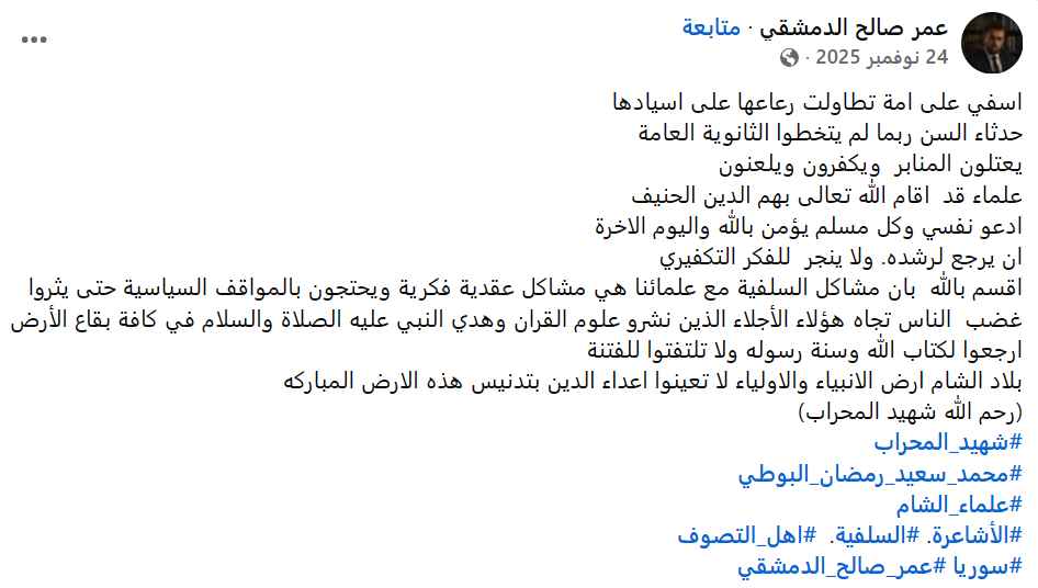 • نص الانتهاك الموثق: (ما ينبغي للأوقاف أن يسمحوا لأتباع محمد بن شمس الدين أن يسرحوا ويمرحوا في المدن السورية وينشروا فكرهم المنحرف)