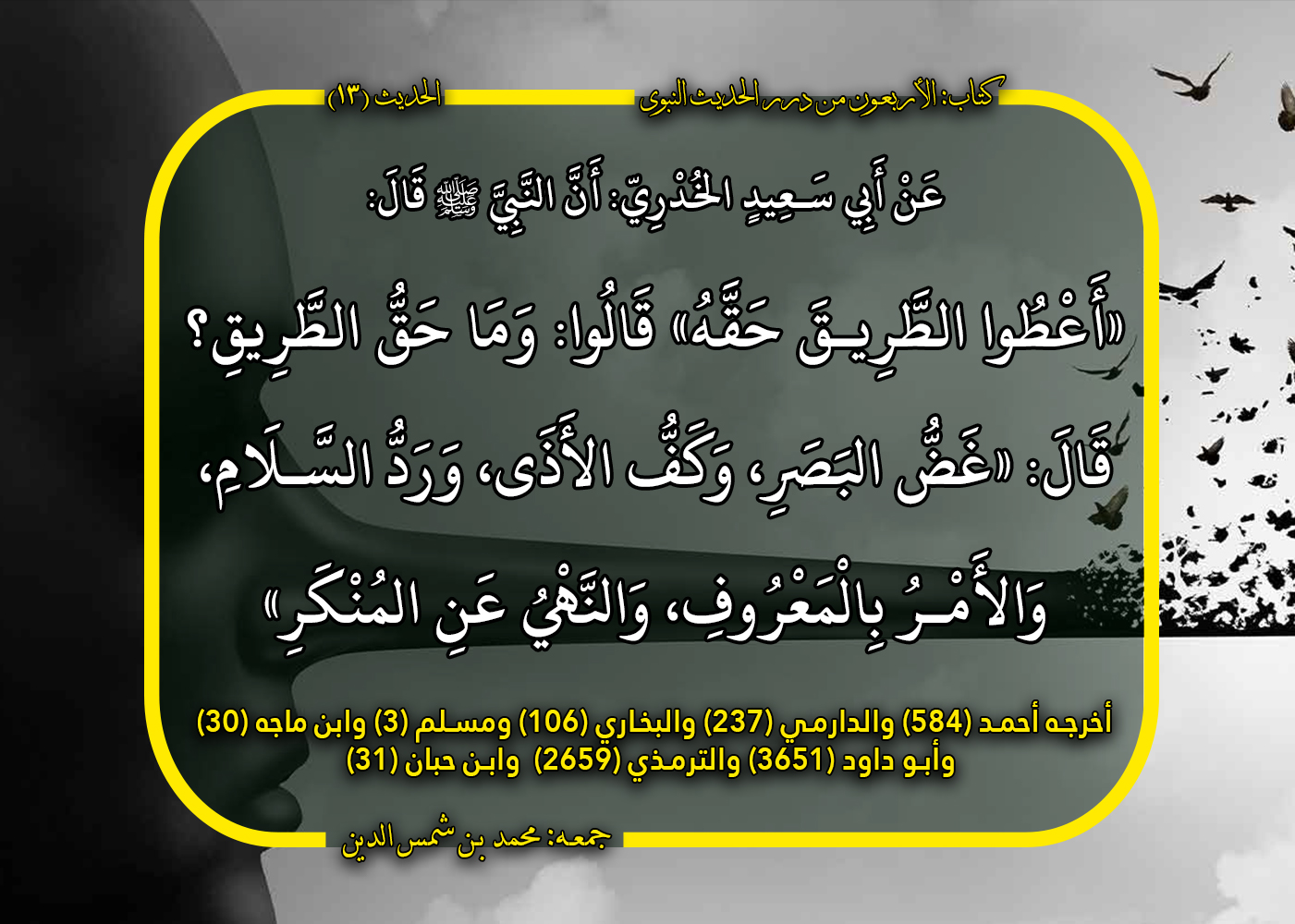 Visited 224 times, 1 visit(s) todayالدرر 13 أعطوا الطريق حقه ، غض البصر، وكف الأذى، ورد السلام، والأمر بالمعروف، والنهي عن المنكر Post navigation الدرر 12 من كذب علي متعمدا فليتبوأ مقعده من النارالدرر 14 من تسمع إلى حديث قوم، وهم له كارهون، صب في أذنه الآنك، ومن تحلم عذب حتى يعقد شعيرة وليس بعاقد، ومن صور صورة كلف أن ينفخ وليس بنافخ